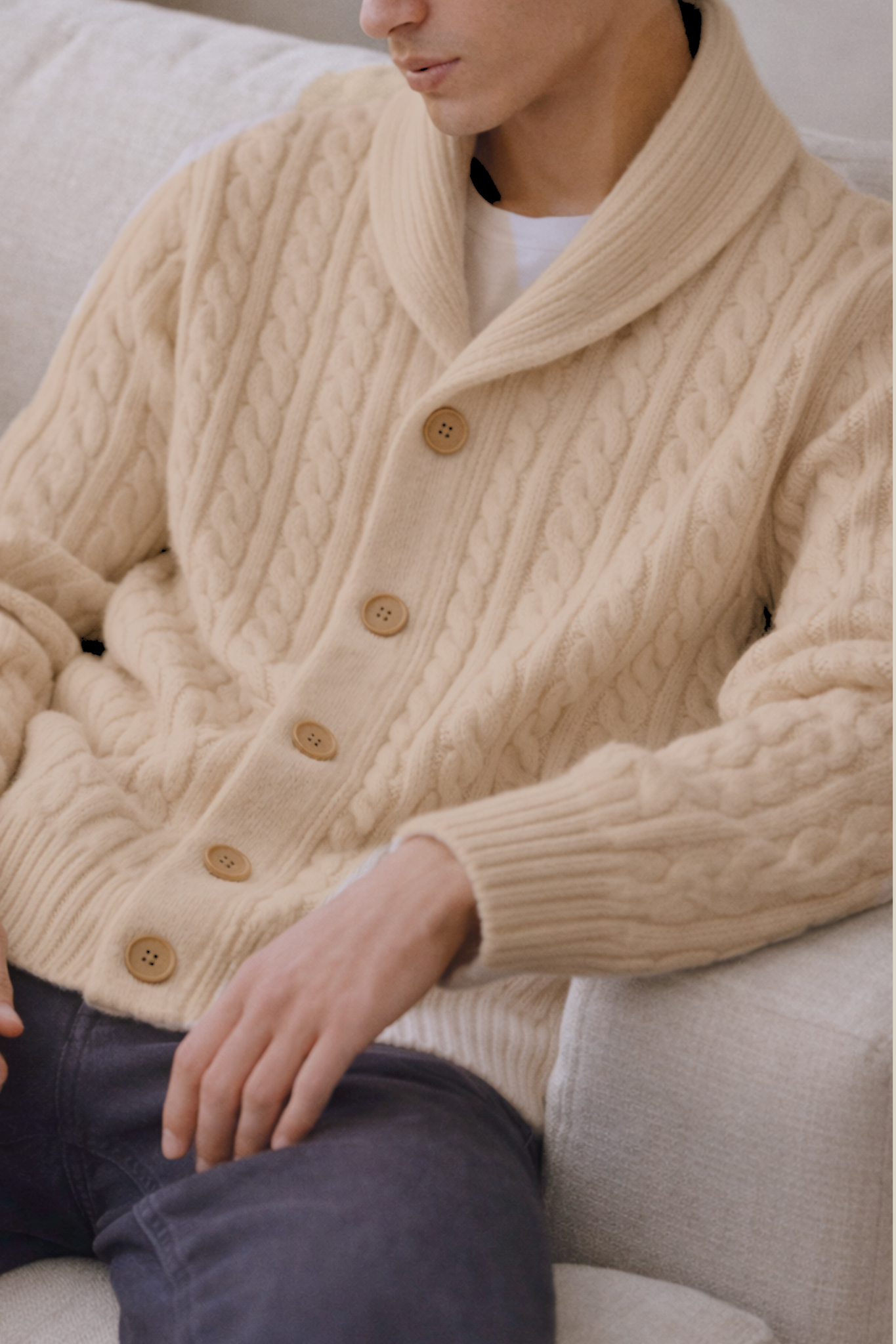 Wrap yourself in timeless craftsmanship with the Heritage Cable-Knit Shawl Cardigan Sweater—a piece designed for understated luxury and modern comfort. Crafted with a refined, slim cable-knit pattern, this cardigan features a structured shawl collar, clean button placket, and a perfectly balanced oversized silhouette.
