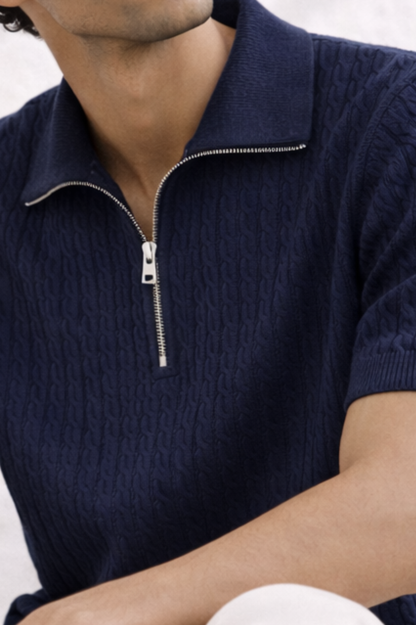 Designed in a relaxed fit, the silhouette drapes naturally while maintaining clean lines. The ribbed polo collar is finished with a polished metal half-zip, allowing you to style it open for a laid-back look or zipped up for a sharper profile. The deep royal navy tone delivers timeless sophistication and effortless versatility, pairing seamlessly with tailored trousers or relaxed denim.