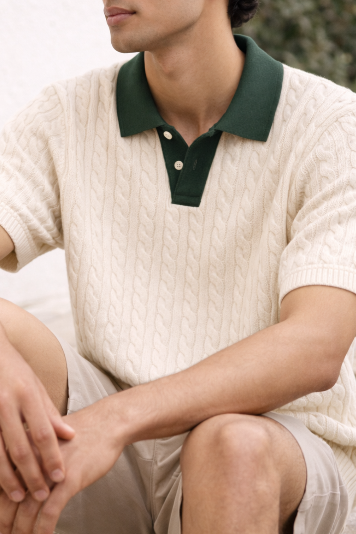 Refined yet relaxed, the Ravello polo is crafted from breathable cotton cable knit that delivers all-day comfort with an elevated texture. Designed in a soft off-white tone, it features a contrast deep-green collar and clean placket for a subtle, vintage-inspired finish.