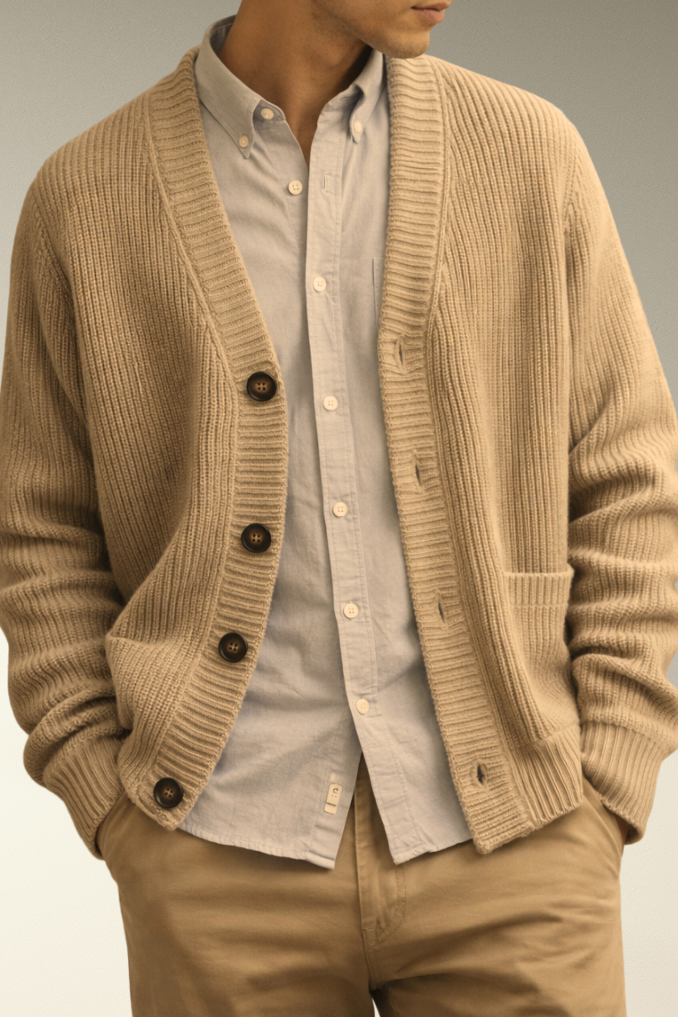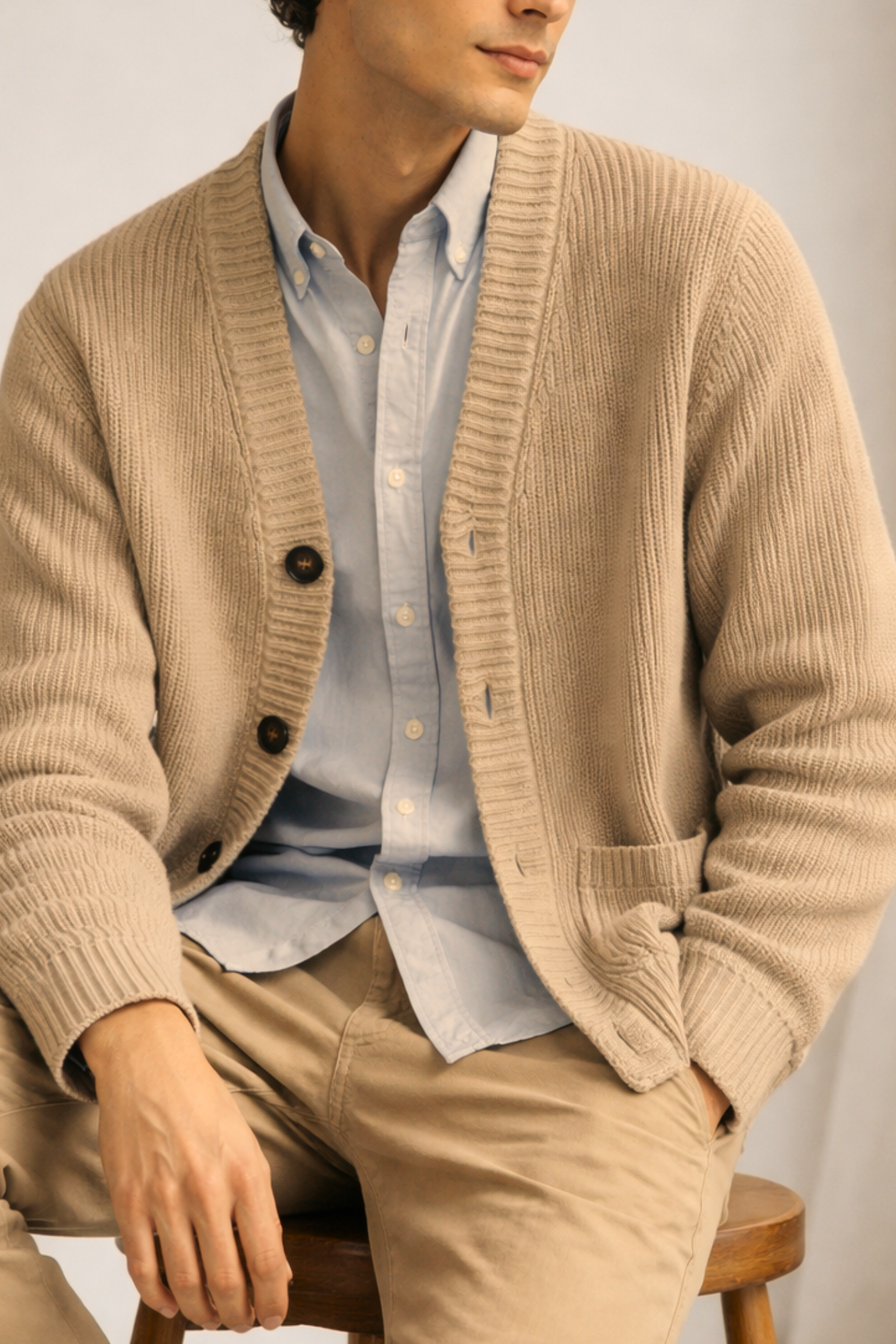 A refined essential designed for effortless layering. The Heritage Ribbed Cardigan is crafted in a soft, heavyweight knit with a structured yet relaxed drape. Featuring a deep V-neck, ribbed placket, and classic button closure, it balances timeless design with everyday comfort.