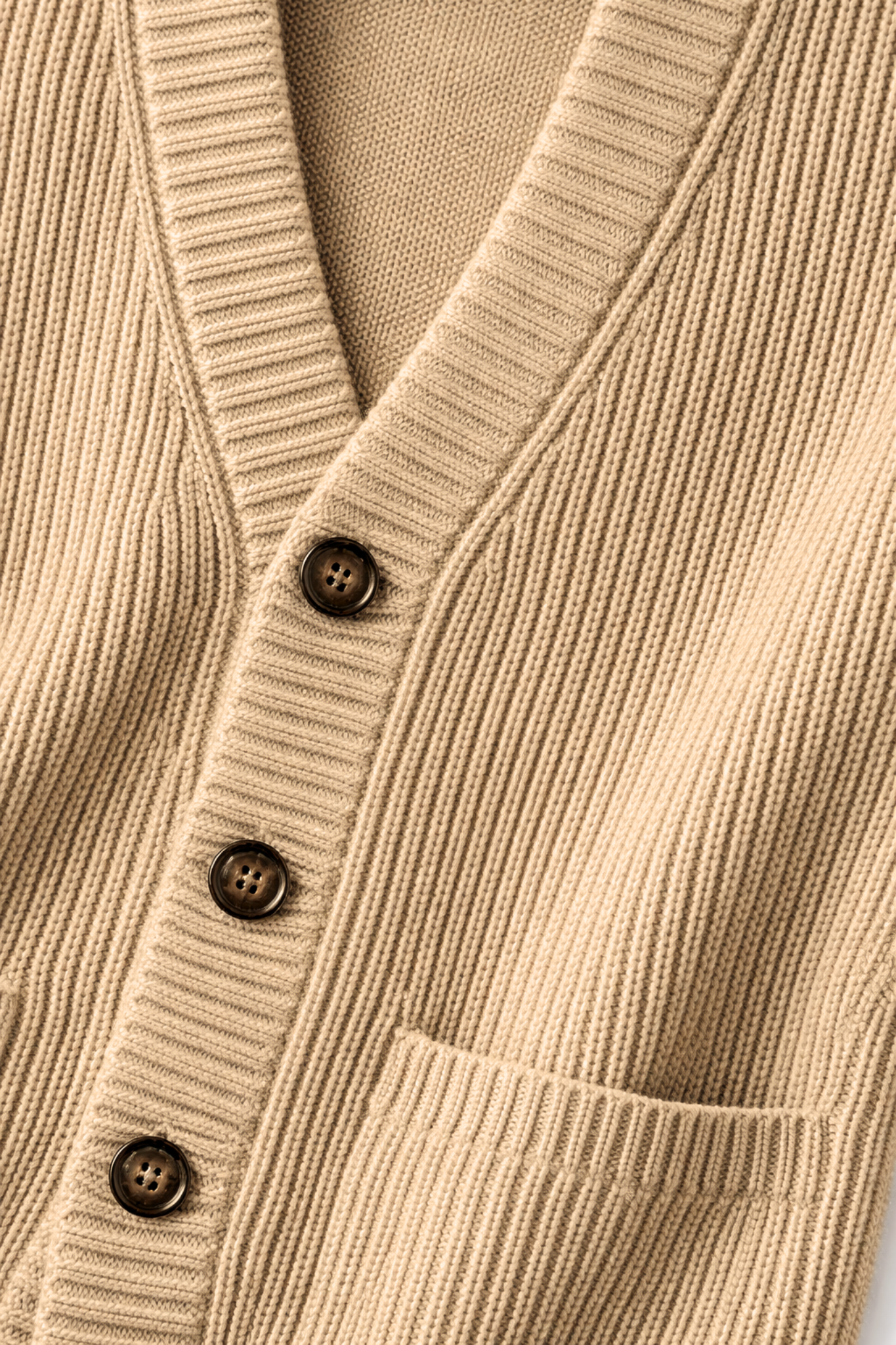 The textured rib construction adds subtle depth, while the neutral oat-beige tone makes it endlessly versatile—perfect over a shirt or worn on its own. Finished with two front patch pockets and ribbed cuffs and hem, this cardigan is an understated staple for a modern, elevated wardrobe.