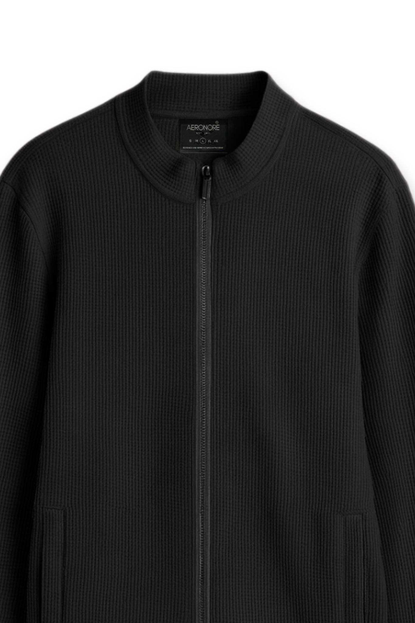 Relaxed Fit Waffle Knit Mock Neck Full Zipper - Midnight Black